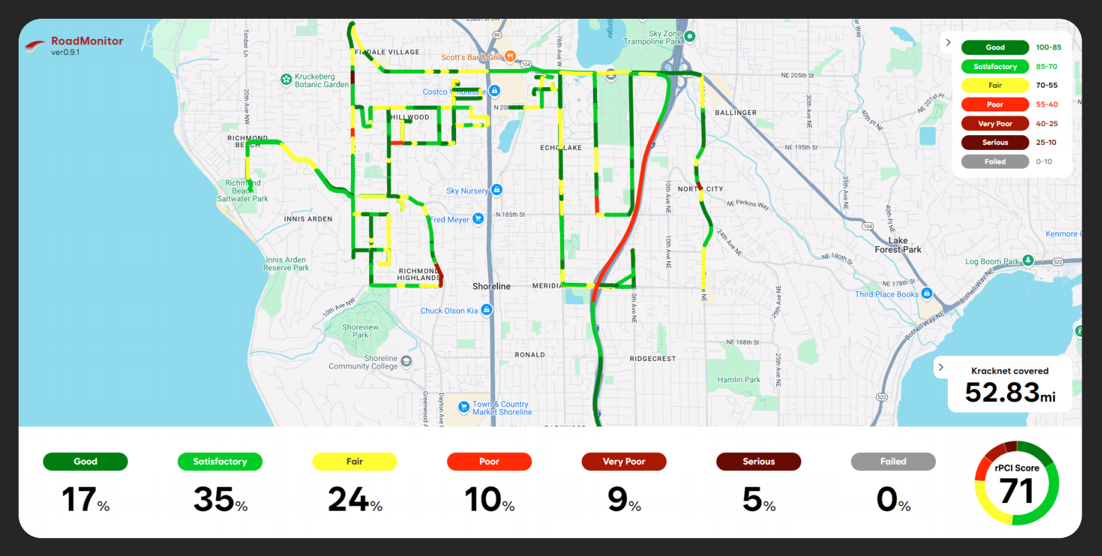 rPCI changes the game with on demand 360° imagery, crack overlays, and intuitive dashboards that make pavement conditions easy to see and understand. Visual clarity leads to faster decisions and greater buy-in from non-technical stakeholders. Check out the image below.